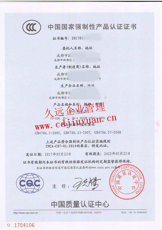CQC標志產(chǎn)品認證證書